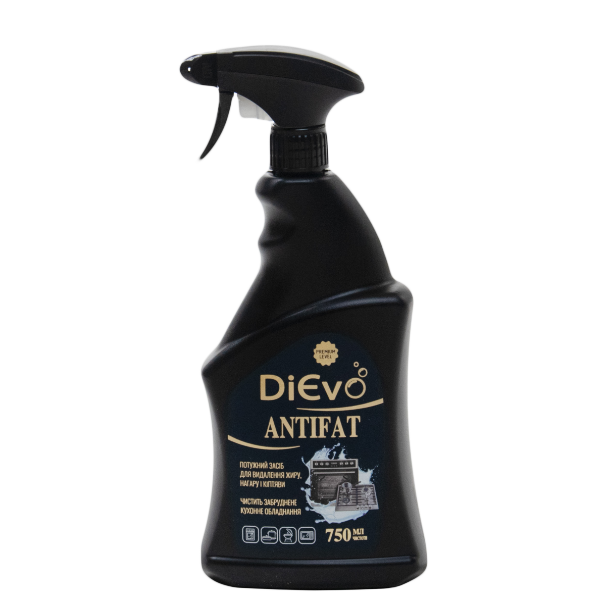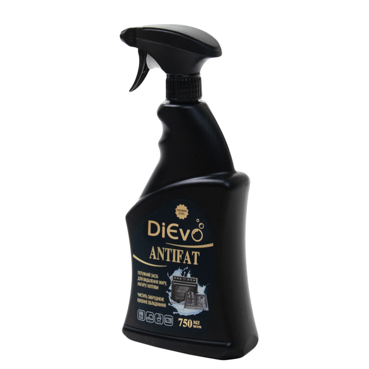Засіб для видалення жирів AntiFat Premium з розпилювачем 750мл ТМ DiЄvo призначений для видалення жиру, нагару і кіптяви. Підходить для чищення НВЧ печей, барбекю, грилю, витяжок, духовок, плит, варильних поверхонь.
